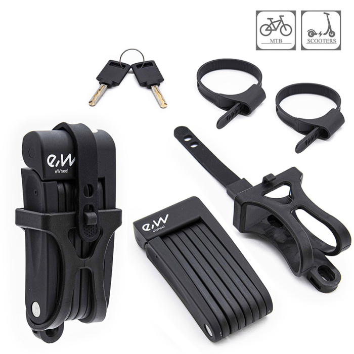 Antifurtul Ewheel Model 5 pentru trotinete electrice este un sistem de securitate compact și eficient, conceput pentru a proteja trotineta împotriva furtului atunci când este parcată în spații publice. Designul pliabil permite fixarea trotinetei de obiecte solide precum stâlpi, suporturi de biciclete sau garduri, oferind un nivel bun de protecție în utilizarea zilnică.